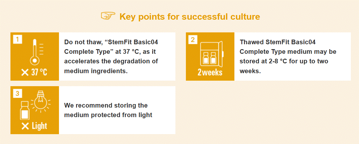 StemFit Basic04 Complete Type is provided frozen medium and can be stored at below -20 °C until use. Use sterile techniques when using this medium.