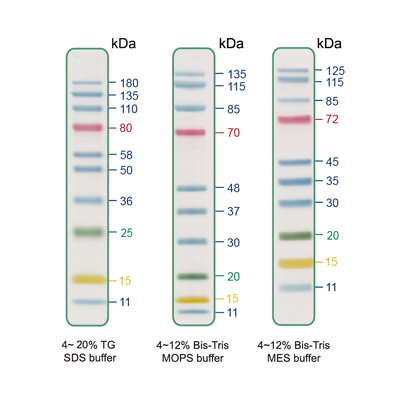The Prestained Protein Ladder, Mid Range is a combination of 10 pre-stained proteins with molecular weights from 11 to 180 kDa. The 10 recombinant proteins are covalently coupled with blue chromophore, while a red band at 80 kDa, a green band at 25 kDa, and a newly designed yellow band at 15 kDa serve as reference bands. The Prestained Protein Ladder, Mid Range keeps track of the size and separation of proteins during SDS-polyacrylamide gel electrophoresis, approximating the target protein size and validating the Western transfer efficiency on PVDF, nylon, or nitrocellulose membranes.