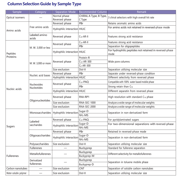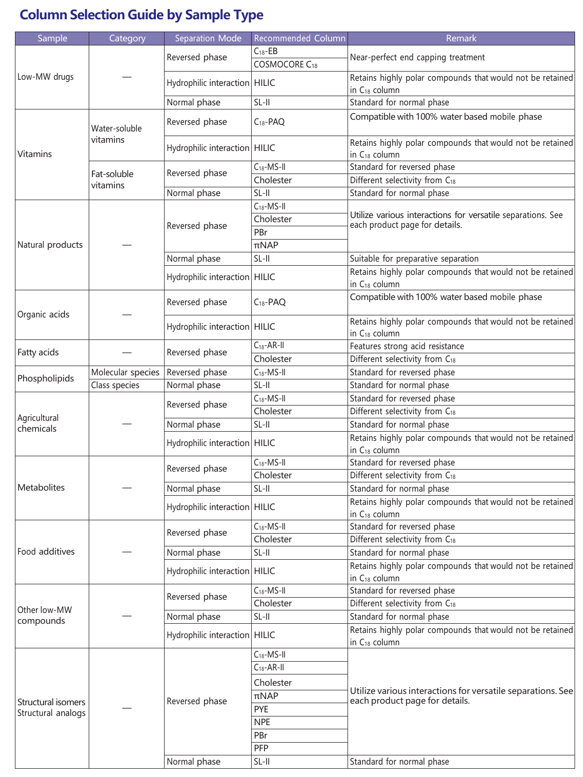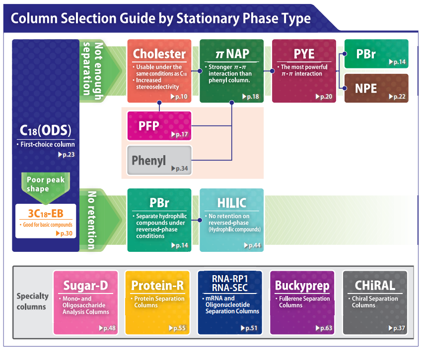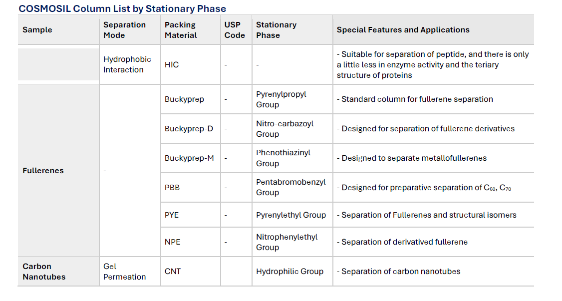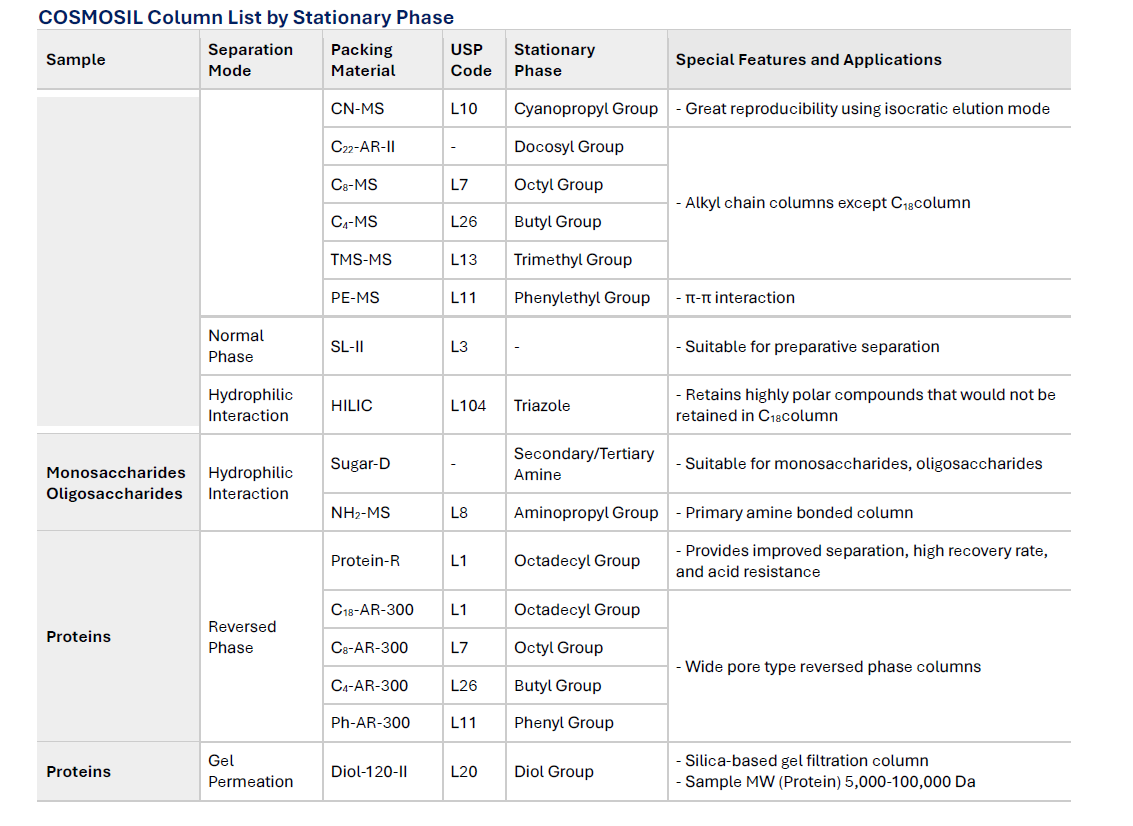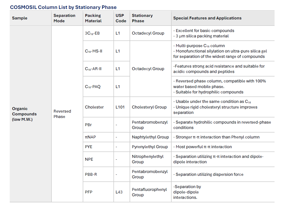Reversed phase HPLC columns have been widely used because of their superior resolution, high theoretical plate number and ease of use. Since hydrophobic interaction is the dominant separation mechanism in reversed phase chromatography, conventional stationary phases such as C18 and C18 do not offer optimum selectivity for compounds with similar hydrophobicity. COSMOSIL offers a broad selection of columns with unique stationary phases for separation of these difficult analytes. These columns offer improved separation of structurally similar compounds that are difficult to analyze with a C18 type column.