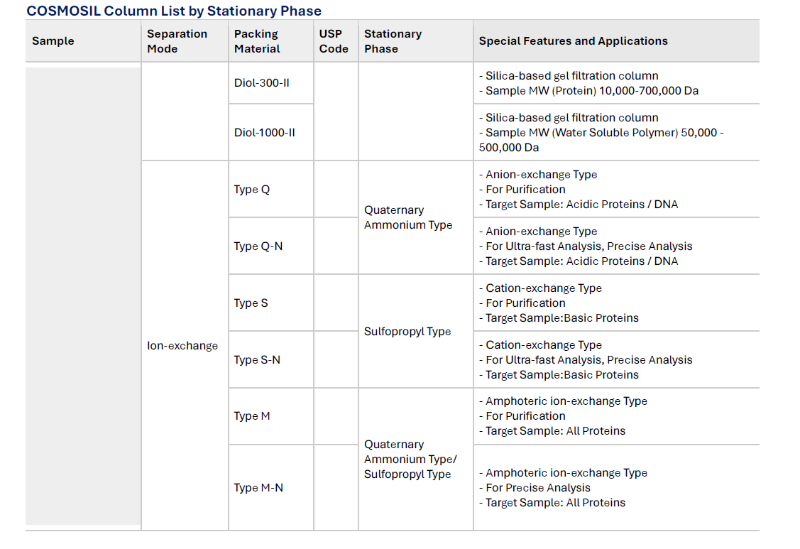 | L20 | Dihydroxypropane groups chemically bonded to porous silica particles, 5 to 10 µm in diameter | COSMOSIL Diol-120-II COSMOSIL Diol-300-II COSMOSIL Diol-1000-II |