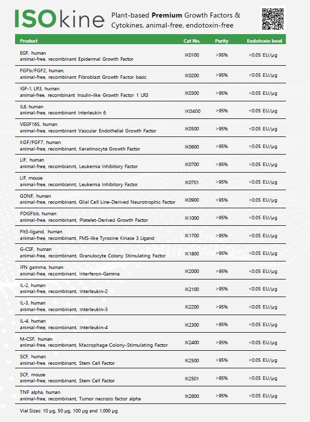 Biological activity of ISOkine is at least comparable but generally higher than other commercially available growth factors and cytokines, reflecting the proper and efficient eukaryotic folding and glycosylation pattern of proteins produced in plant cells.