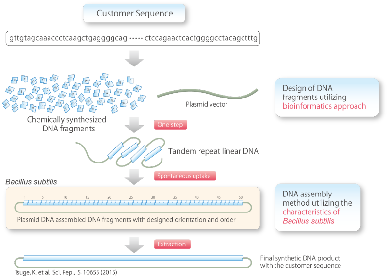 OGAB™ (Ordered Gene Assembly in Bacillus subtilis) by Synplogen is our proprietary DNA fragment assembly method that combines biotechnology and digital technology. This method is an excellent technique for synthesizing DNA of various lengths from a few kb to over 100 kb, high/low GC content, containing repeat sequences, and other complex sequences by linking more than 50 DNA fragments. We have established a production process consisting of (1) design of optimal DNA fragments for assembly (OGAB block) using our proprietary software, (2) synthesis and assembly of OGAB block using automated equipment, and (3) circularization and cloning of DNA utilizing the characteristics of B. subtilis, and succeeded in commercial production of synthetic DNA by the OGAB™ for the first time in the world.