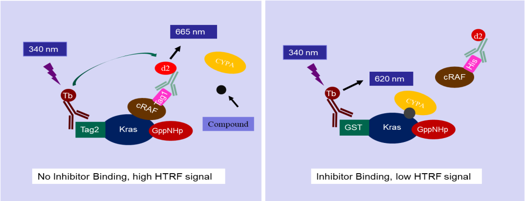 The KRAS (WT) Inhibitor Assay Kit is a TR-FRET–based assay designed to screen KRAS inhibitors and quantify KRAS-inhibitor binding affinity. In this kit, Tag2-KRAS (WT) is loaded with GppNHp to represent the active form of KRAS, while the Ras binding domain (RBD) of cRAF carries a Tag1 at its N-terminus. A terbium-labeled anti-Tag2 antibody bound to Tag2-KRAS serves as the fluorescence donor (HTRF donor). When Tag1-cRAF binds to KRAS, the donor comes into close proximity with the acceptor fluorophore on the anti-Tag1 antibody, triggering fluorescence resonance energy transfer (FRET). The binding interaction can be quantitatively measured by the ratio of acceptor (665 nm) to donor (620 nm) emission signals. If a CYPA-associated inhibitor binds KRAS and blocks cRAF interaction, the HTRF signal decreases, providing a clear readout of inhibitory activity.